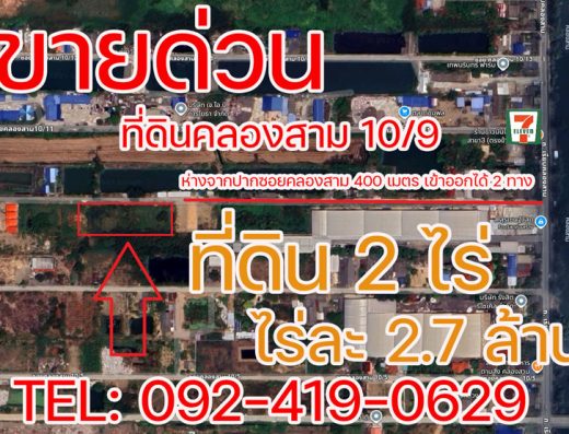 ขายด่วน! ที่ดินคลองสาม 10/9 คลองหลวง 2 ไร่ ราคาต่ำกว่าประเมิน ใกล้ถนนใหญ่เพียง 400 ม. โทร 092-4190629 ขาย For Sale land